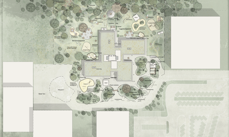 Bygningen får også et tag med grønne vækster og forskellige overdækkede udezoner, der giver endnu flere muligheder for aktiviteter – både ude og inde.